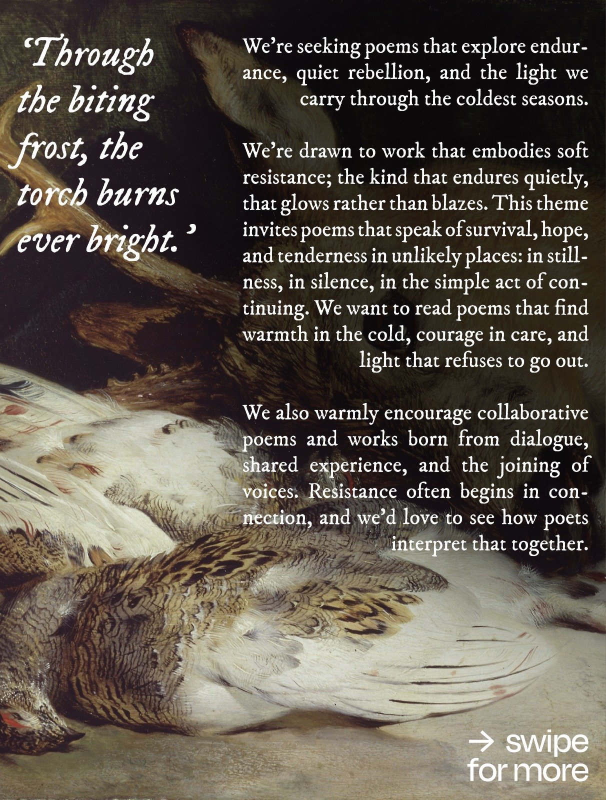 This £5 purchase serves as your entry fee for one poetry submission to the 2025 winter competition. Once you've paid the entry fee, don’t forget to email us your submission at [email protected]! In the body of the email, include a short bio (max 100 words) and a brief note (2–3 sentences) describing the poem’s connection to the theme.
